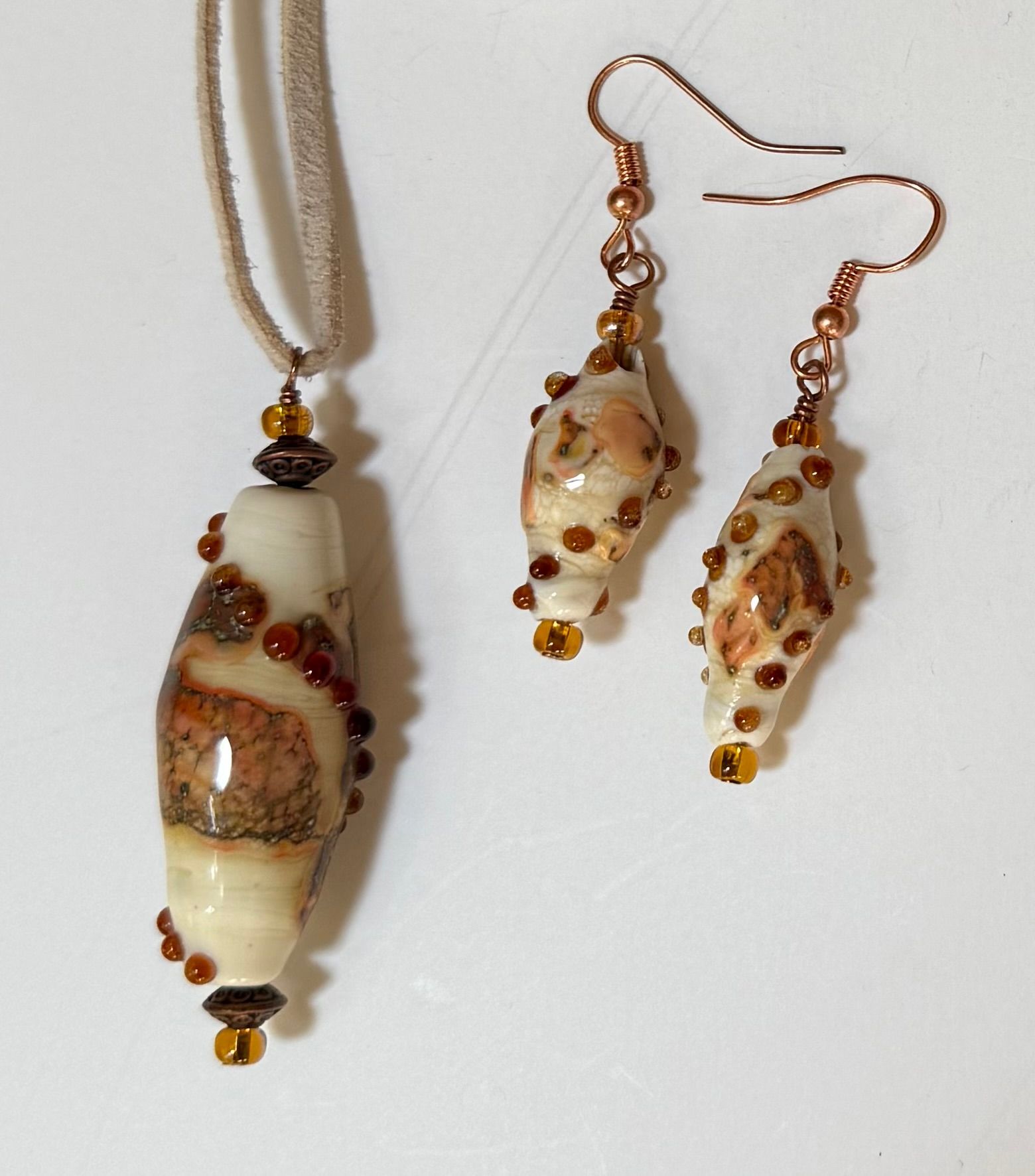 I am a full time software engineer, night time ceramics and lampwork artist. This necklace is made of Canyon de Chelly base glass with reduction glass from Double Helix and raku frit. I used Corina's press to flatten the beads and decorated sparingly with reduction glass. It does remind me of delicious cappuccino and foam art for coffee. I hope you like it as much as I enjoyed opening the kiln. ~Mirela Popovici~