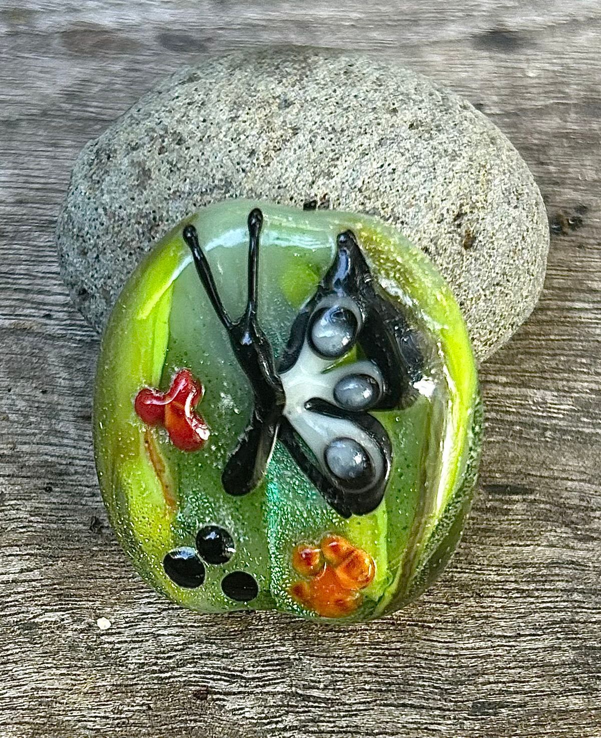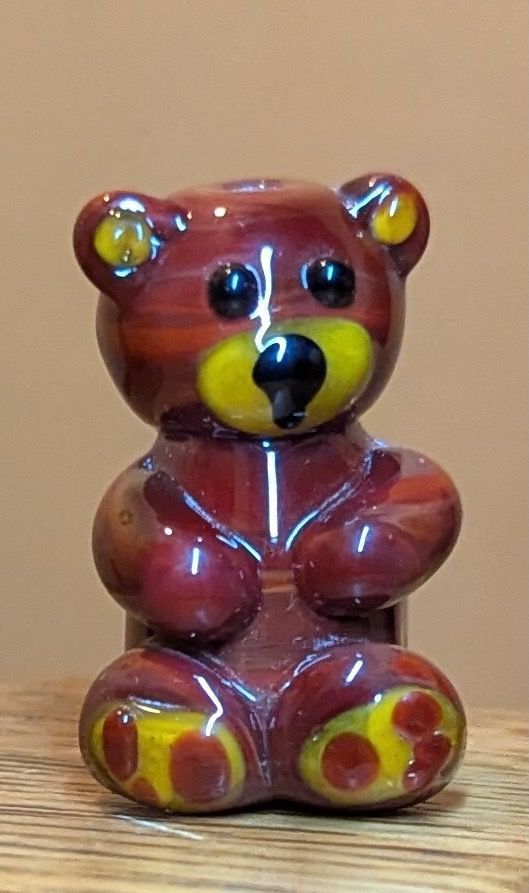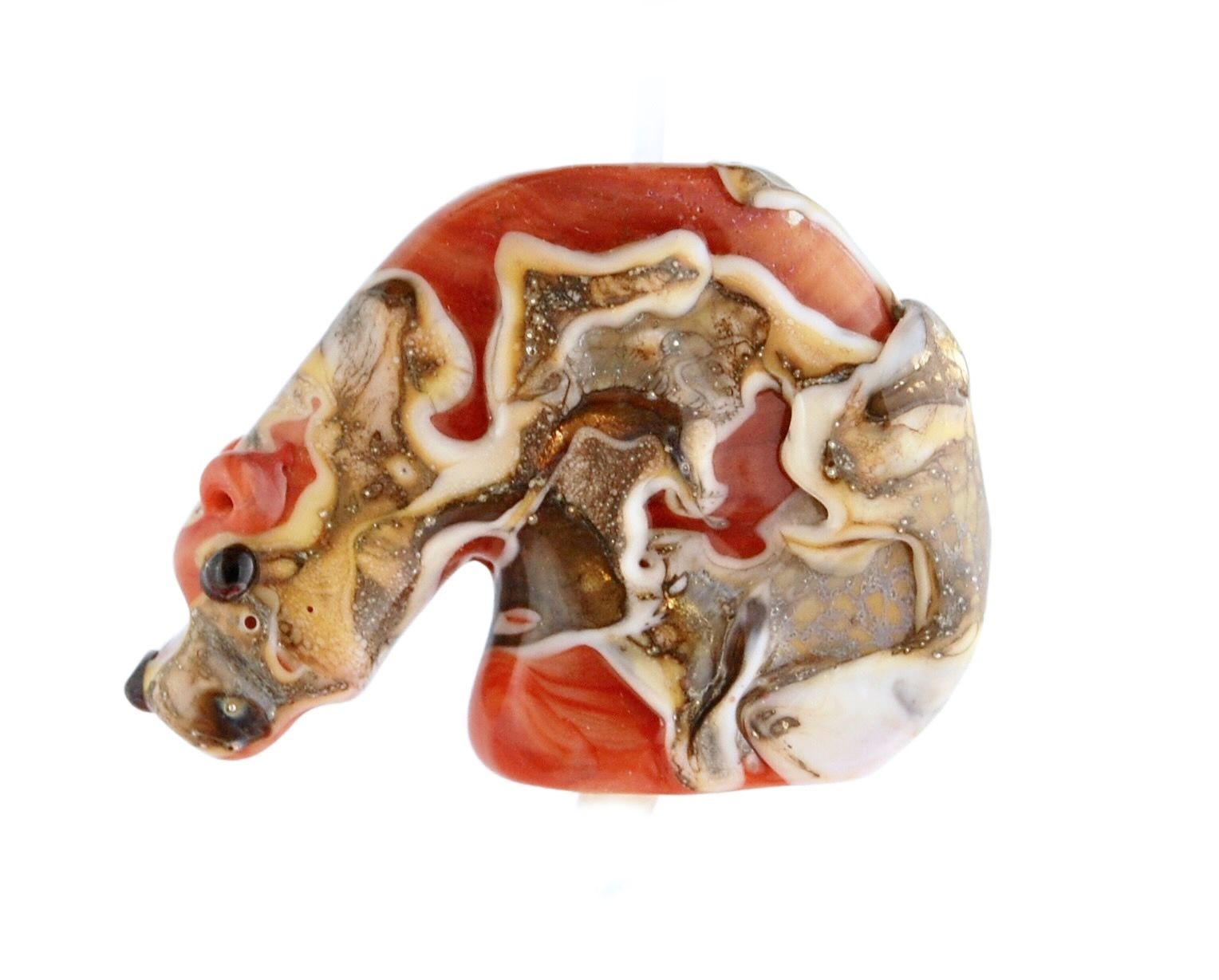 This one is a hat tip to chocolate bunnies. I opted to use some old Effetre Red Roof Tile which seemed the closest. It seems like a potential copyright infringement if I went with the traditional pose that is so this one is mid-leap. And for me doing sculptural beads, extending the legs and ears is a fun personal challenge to keep the glass at the right temperature without breakage or movement. ~Marcy Lamberson~