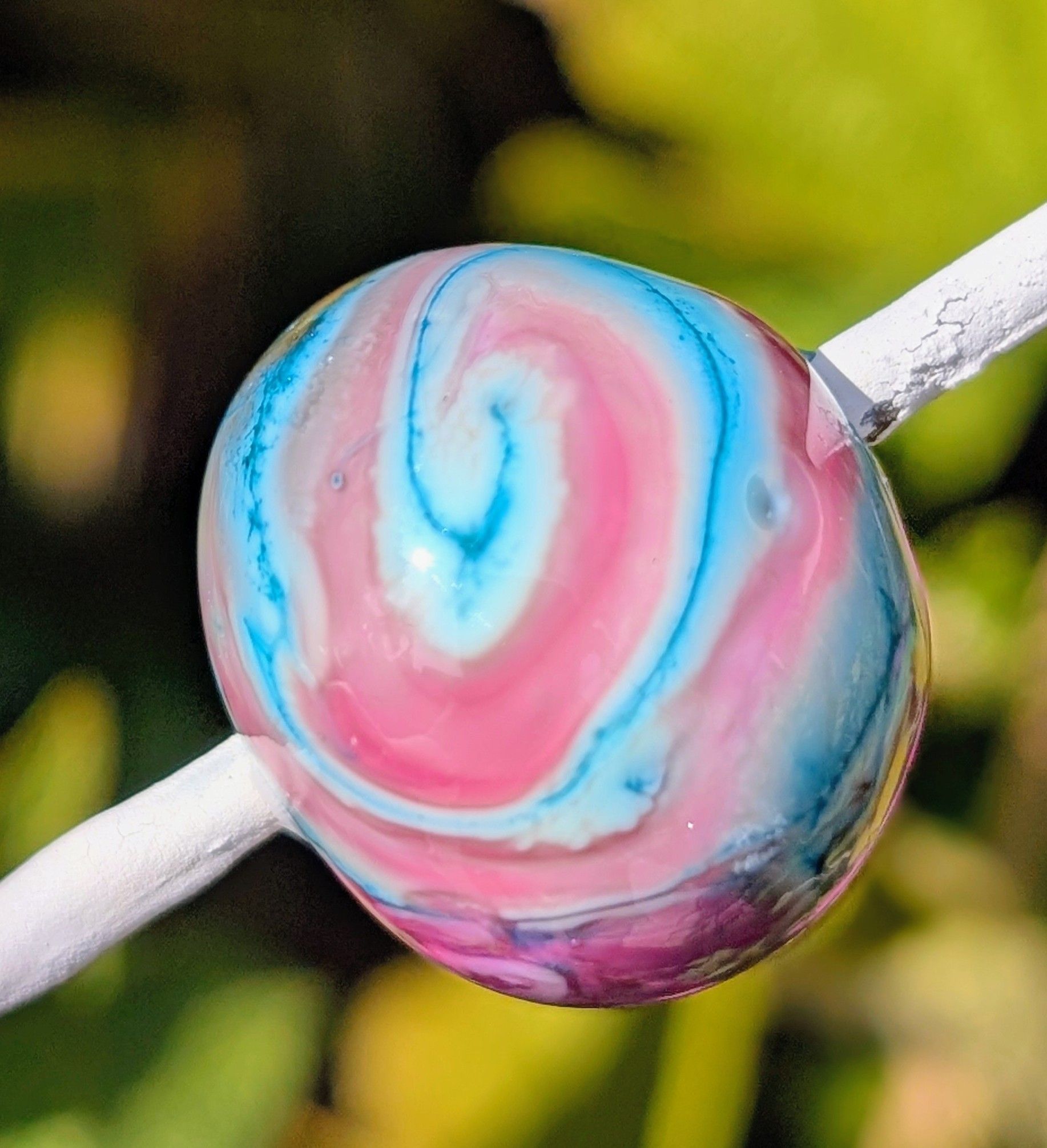 This is a blown white bead made with two connected discs around a puffy mandrel, to which I have applied a copper green and Rubio oro glass shard. I have applied the top most part of the blown shard, which has the pink spiral. I thought a blown bead is suitable for blown shards.