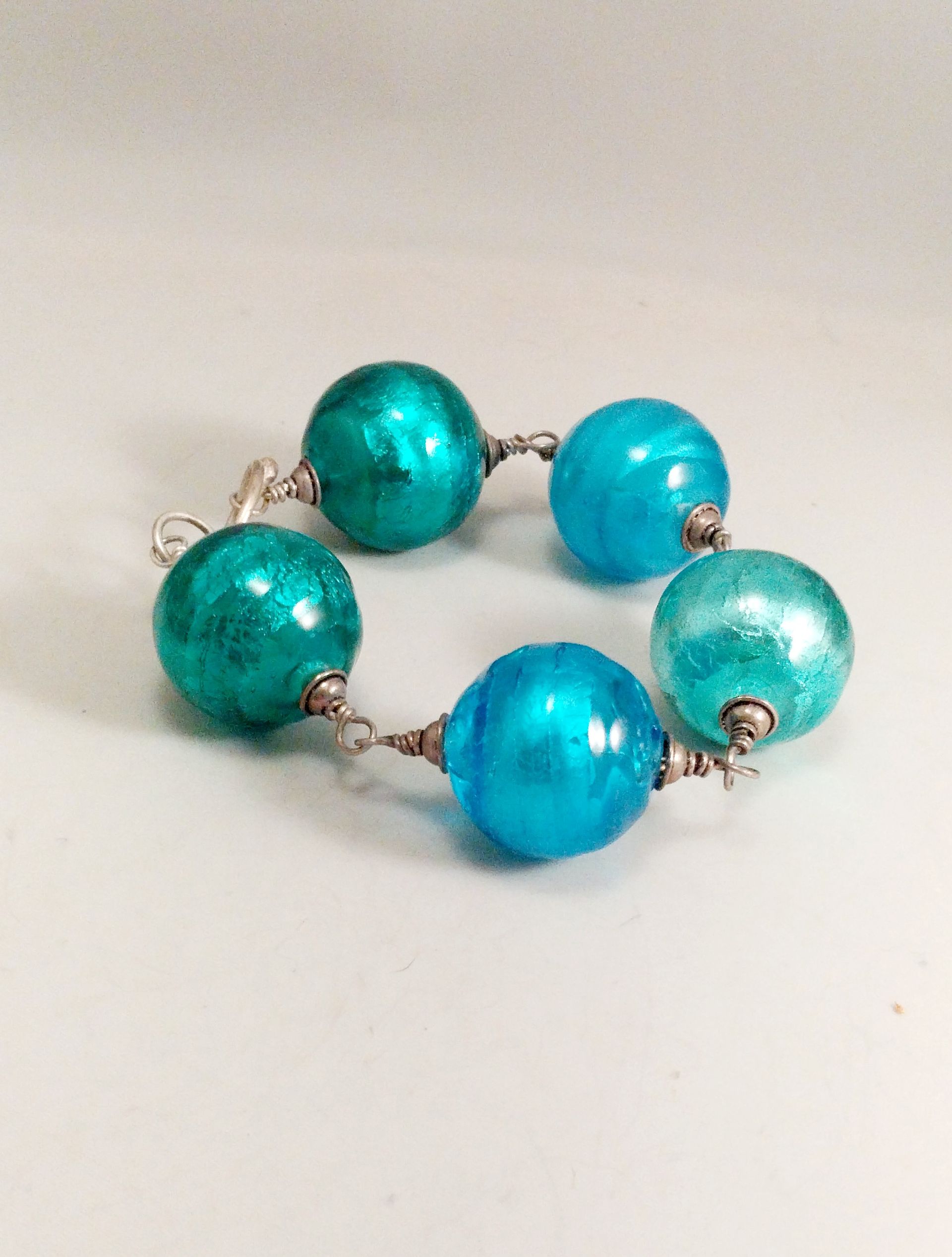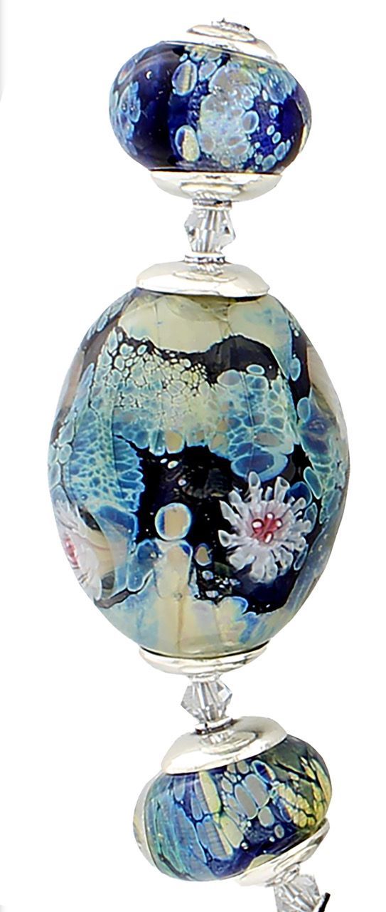 I've been fascinated by glass my entire life. From stringing seed beads to picking up pieces of broken coke bottles, it didn't matter. It was glass. When I went to my first torch class in 1996 it just clicked. I've been melting ever since. Serenade in Blues: encased silver foil hollow beads, approx 1" diameter. ~Susan Chambers~