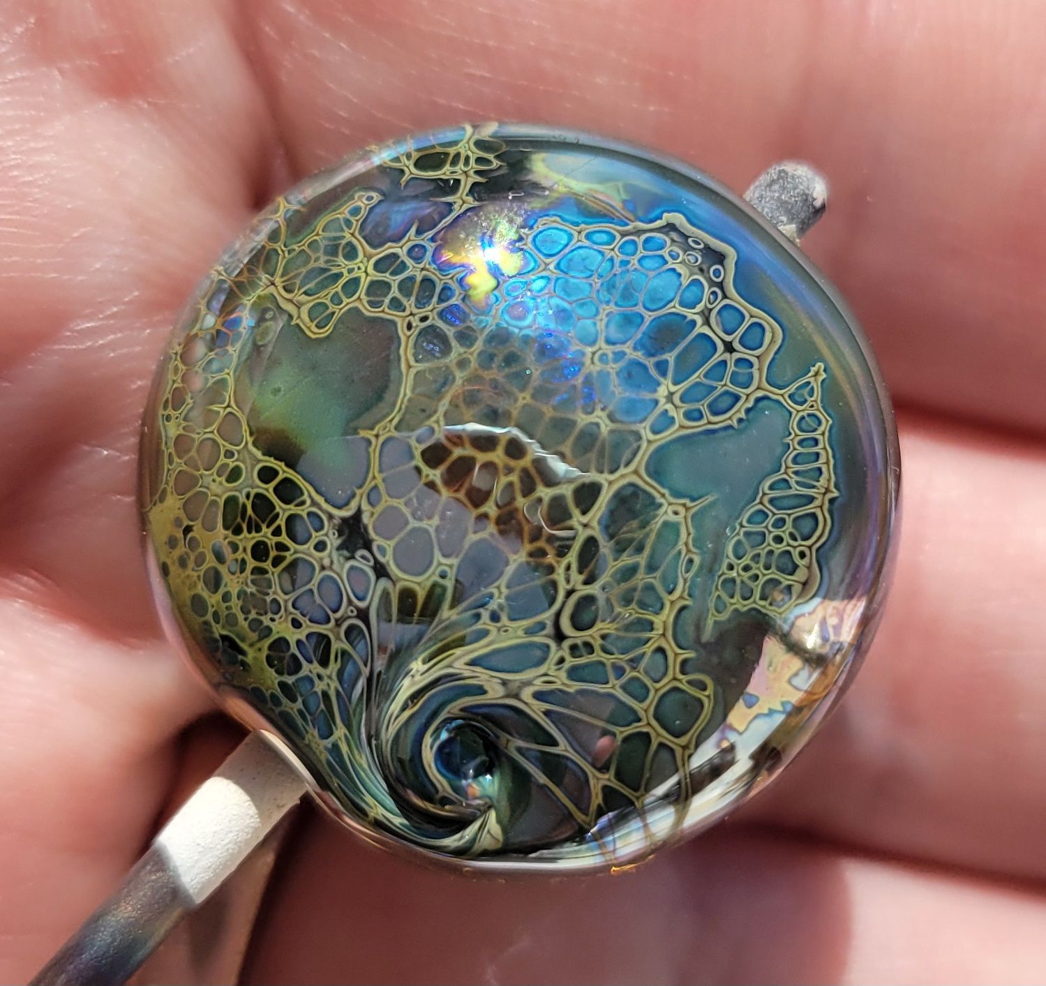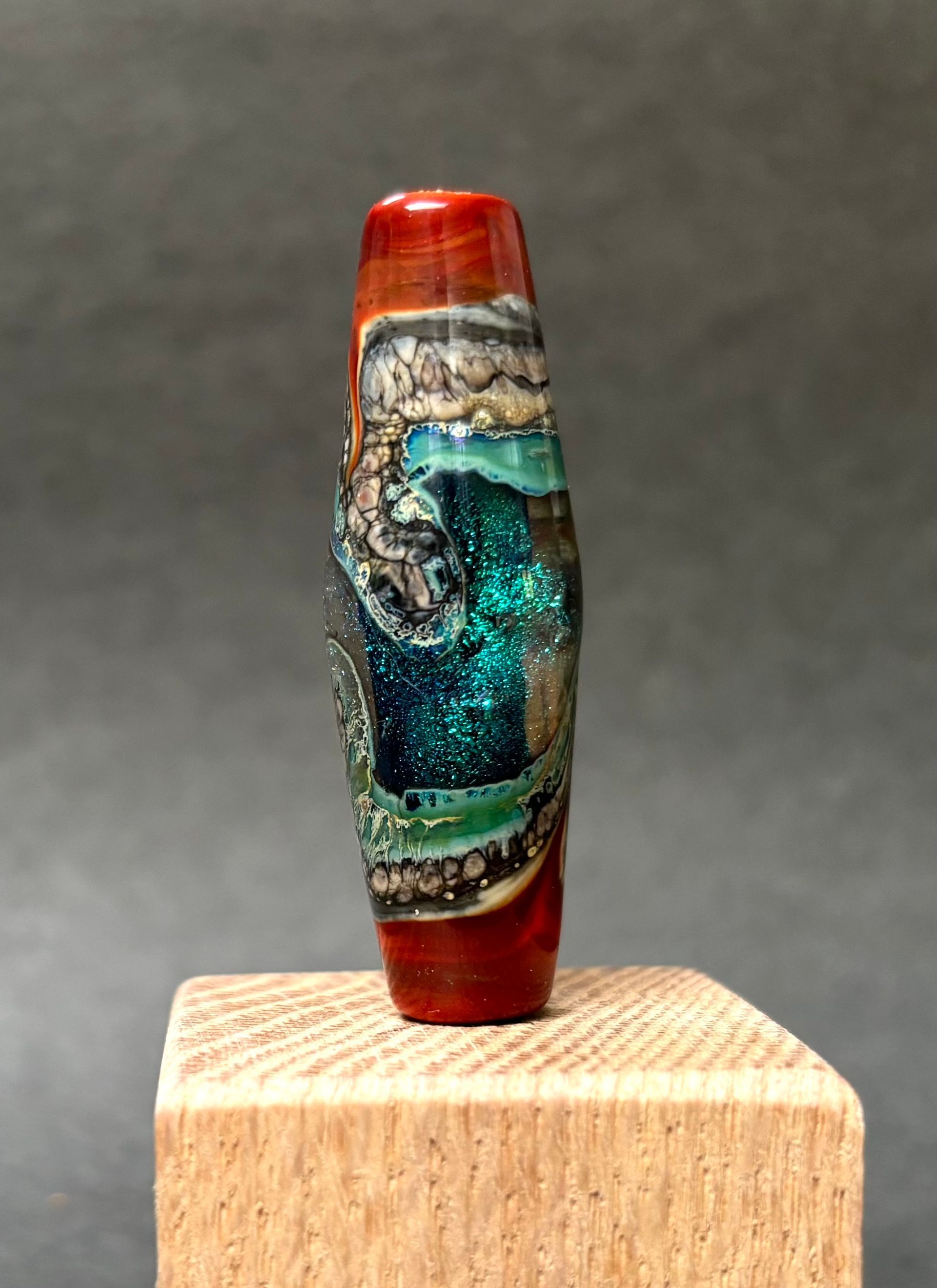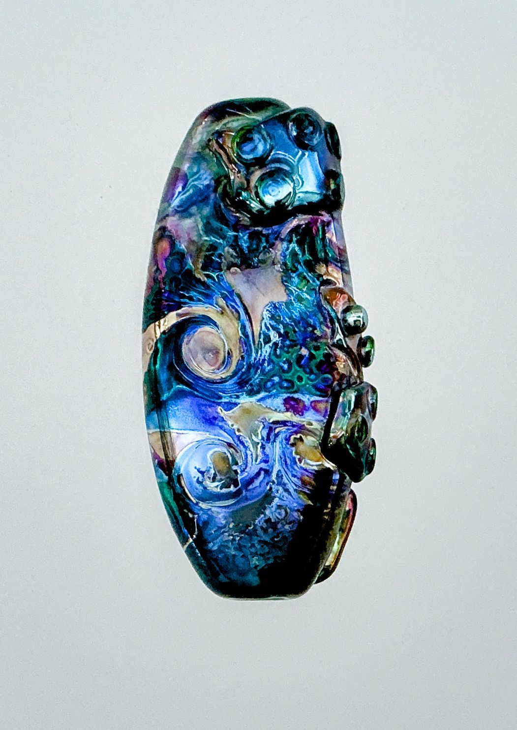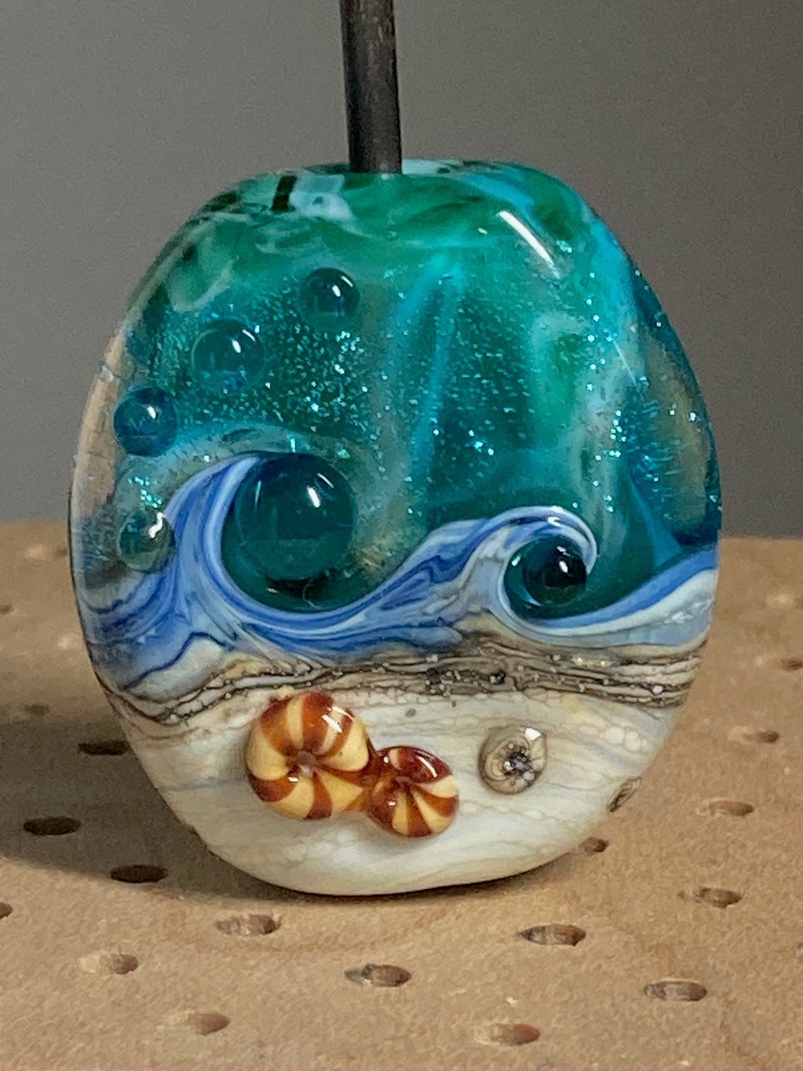 I am very pleased with how this oceanscape bead turned out. The Riley Dichroic really shines through and this is probably my best shaped bead ever! I’ve been practicing these techniques learned from Shelley Woolvin of Frantz Art Glass at her glass at GCBE 2025! ~Wendy Lerch~