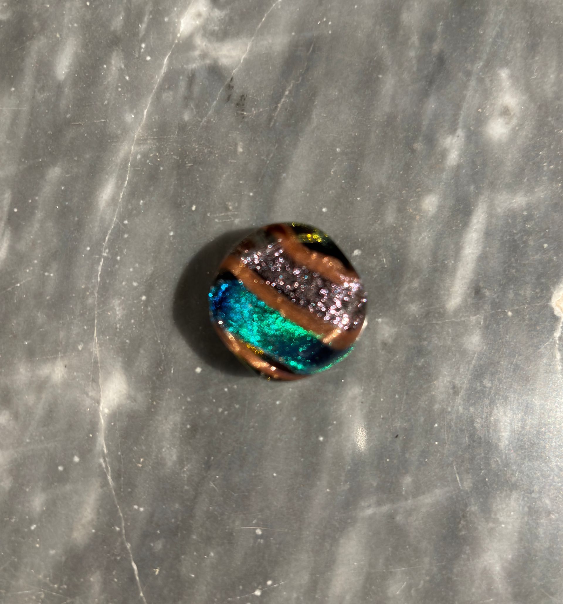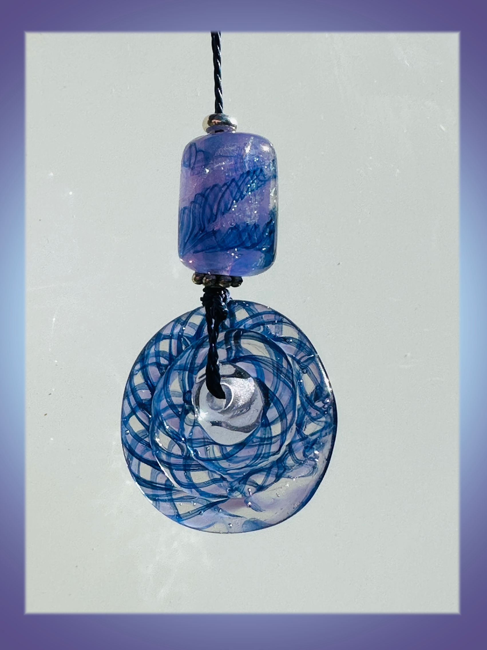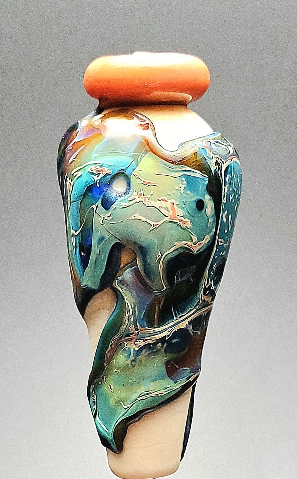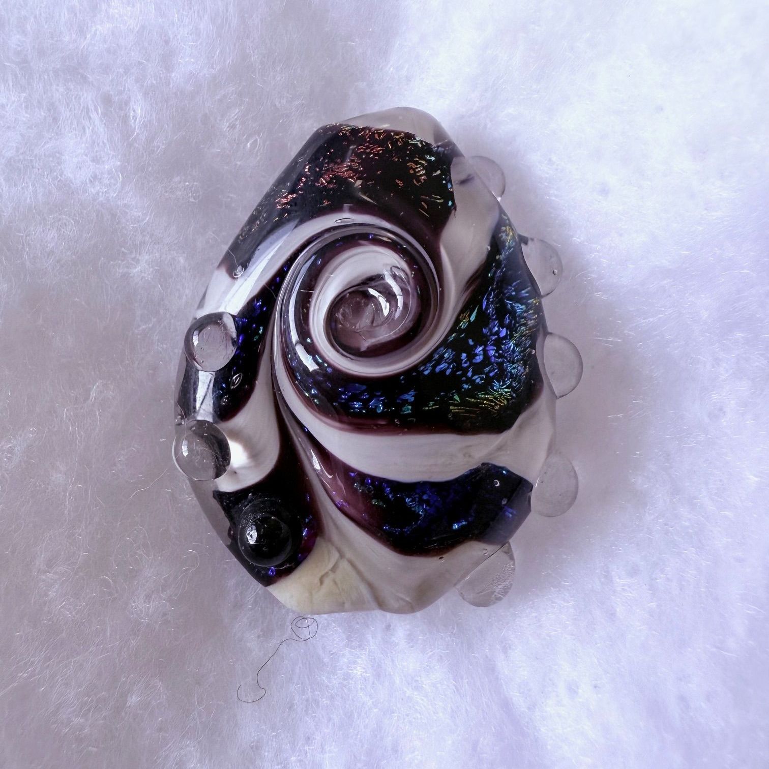 I am very pleased with how this oceanscape bead turned out. The Riley Dichroic really shines through and this is probably my best shaped bead ever! I’ve been practicing these techniques learned from Shelley Woolvin of Frantz Art Glass at her glass at GCBE 2025! ~Wendy Lerch~