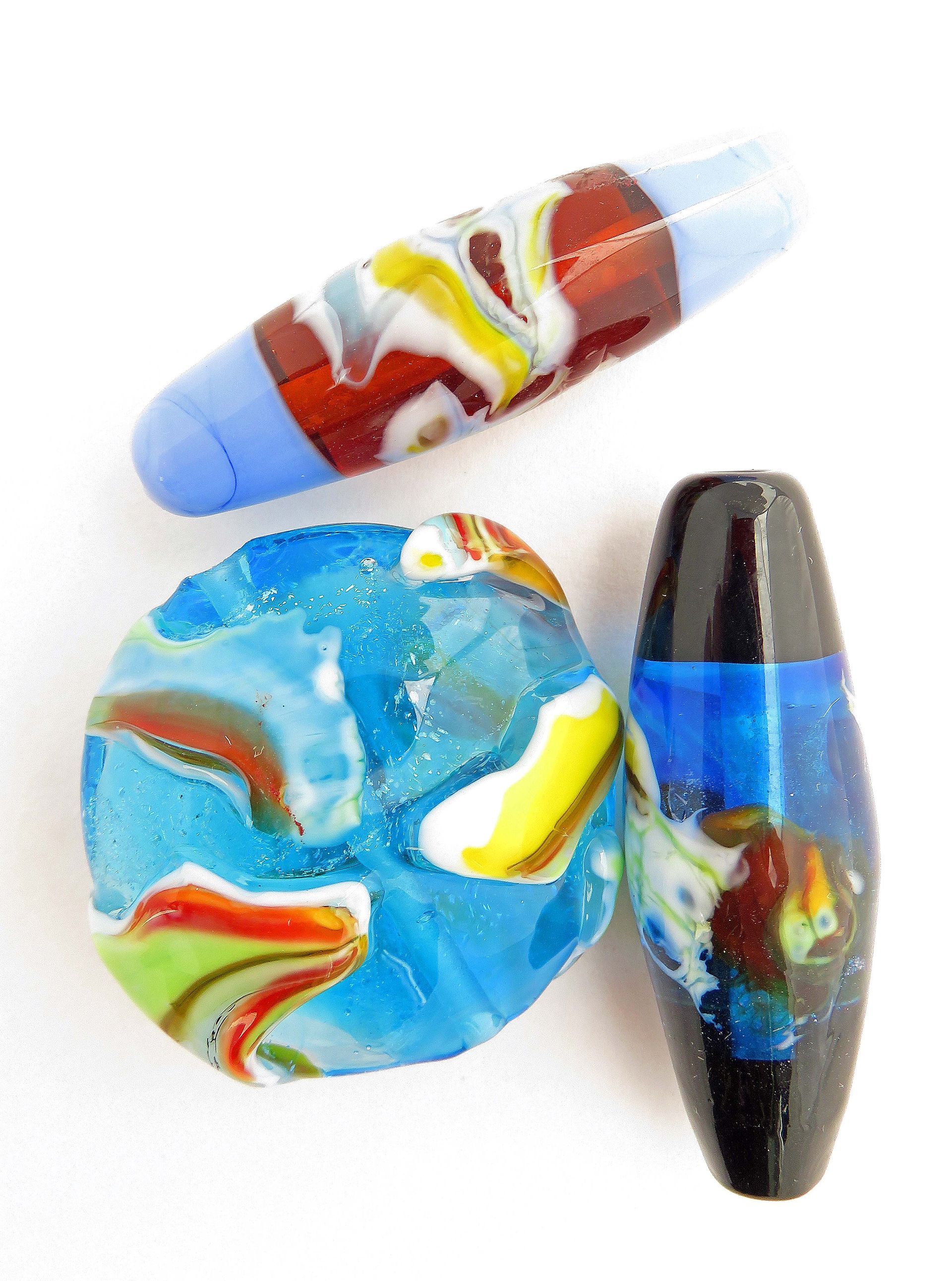 I hadn't made shards in quite a while and had a lot of fun blowing this multi color shard. I left the shards raised on the surface of the lentil bead, which totally changed the shape, and melted the shards in on the tube beads.