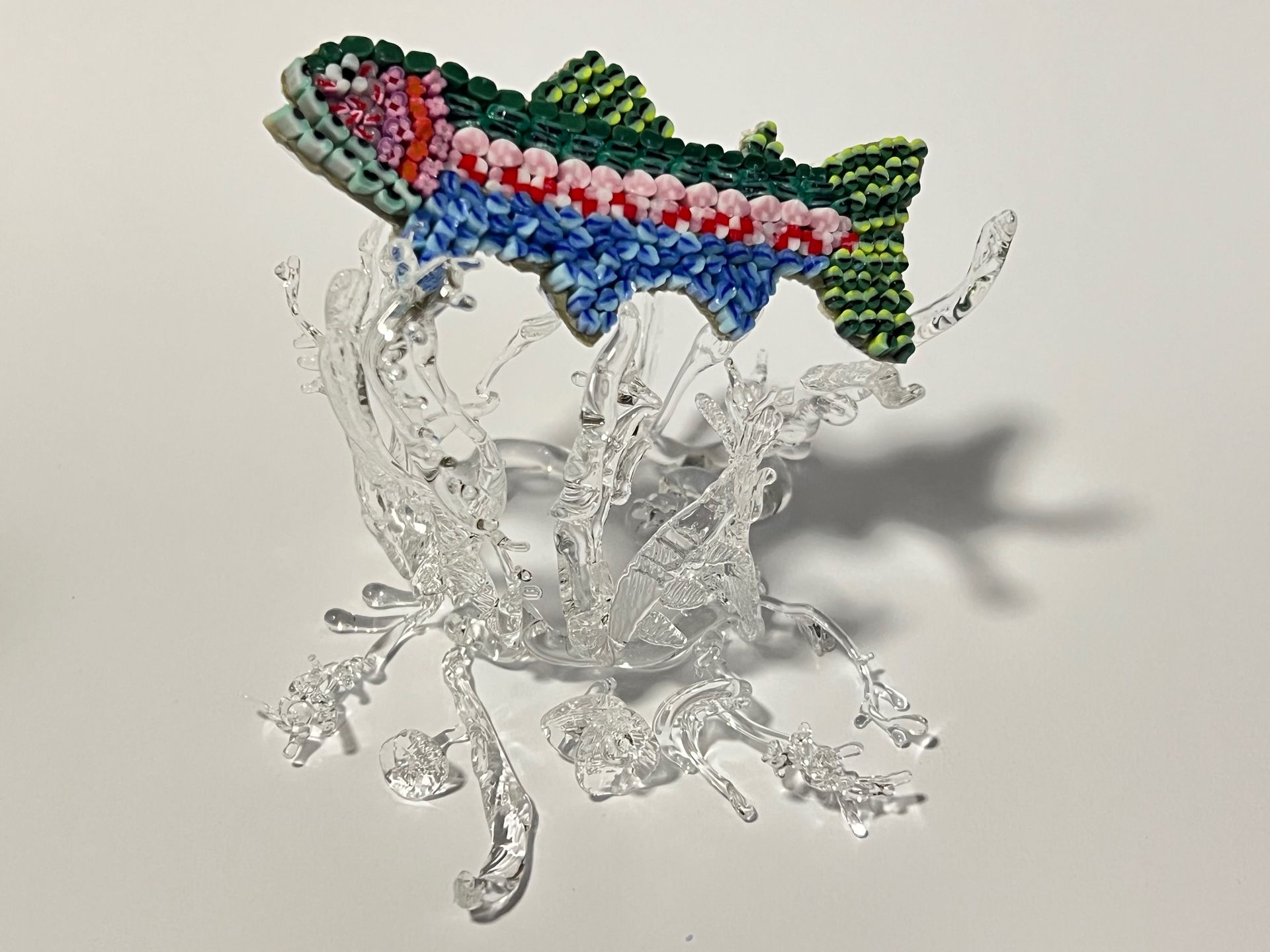 "Swimming in Shards" explores the inherent fragility and resilience of life, particularly within challenging environments. The vibrant, meticulously crafted fish, rendered in a mosaic of beads, symbolizes life's enduring beauty and adaptability. Its dynamic pose, seemingly leaping from a chaotic arrangement of clear, shard-like forms, represents the act of overcoming adversity and finding moments of grace amidst turmoil.