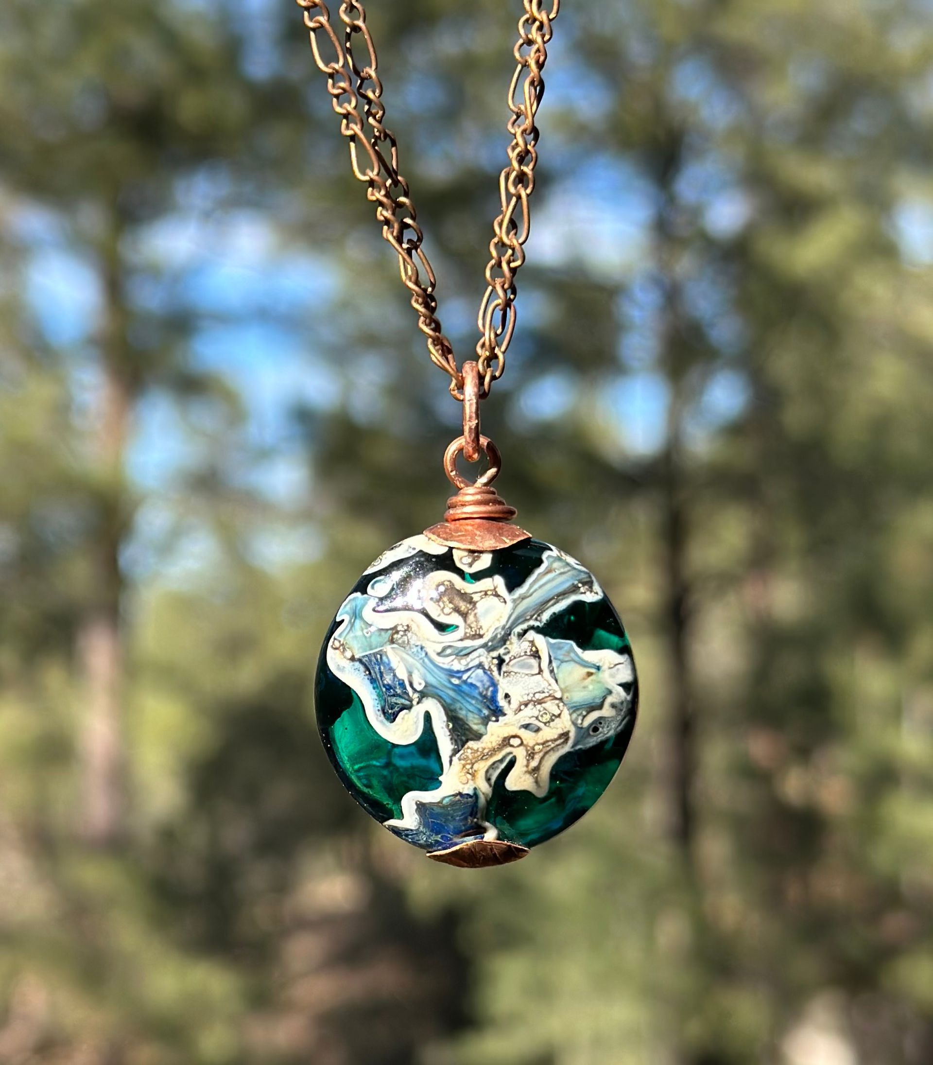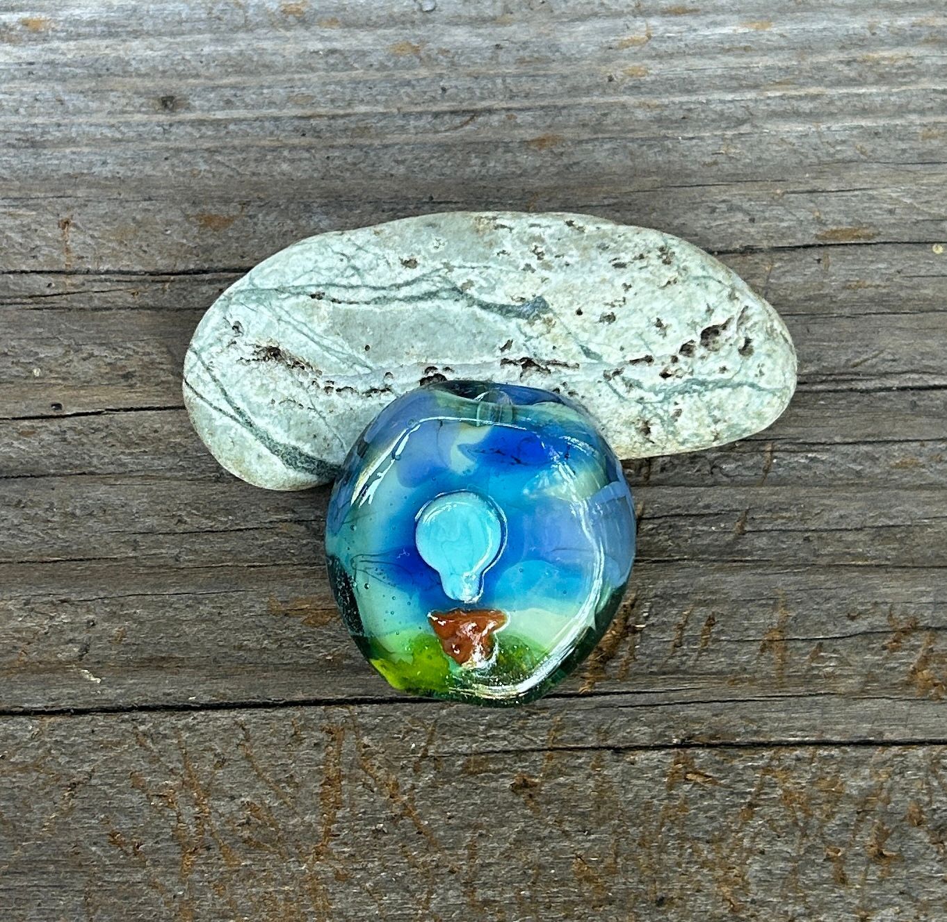 I made this bead using Bullseye glass. I used shards of many shades of green and blue for both the land and the sky. I love the effect.