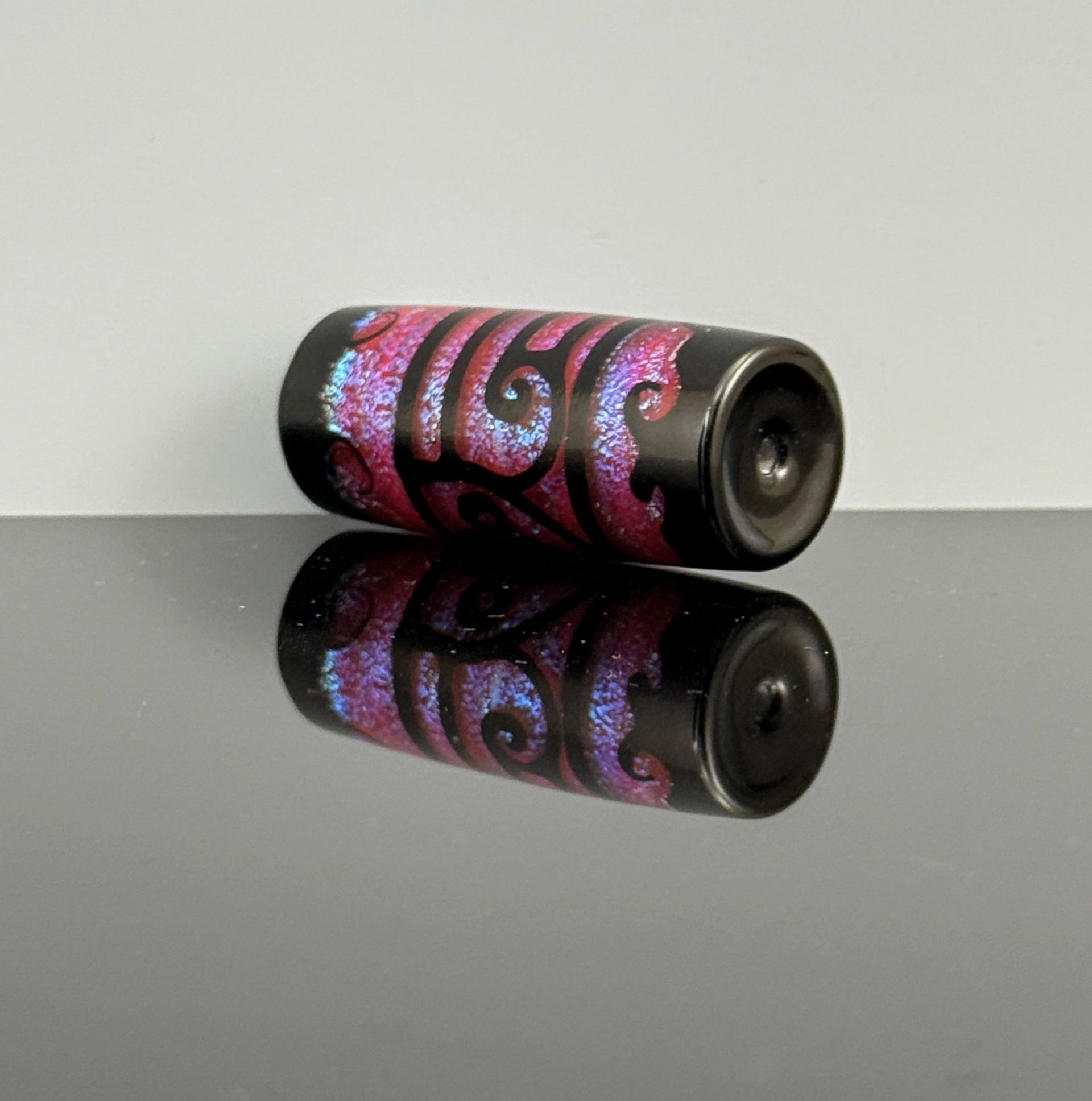 This sparkly bead started with a core of medium red, wrapped in a layer of teal dichroic strip, then cased in clear. Finally, end caps were added and stringer work was applied to the clear surface, both in Reichenbach Deep black. I love dichro for the sparkle, but it is a constant battle not to burn it and trap scum in your beads! ~Laura Simone~