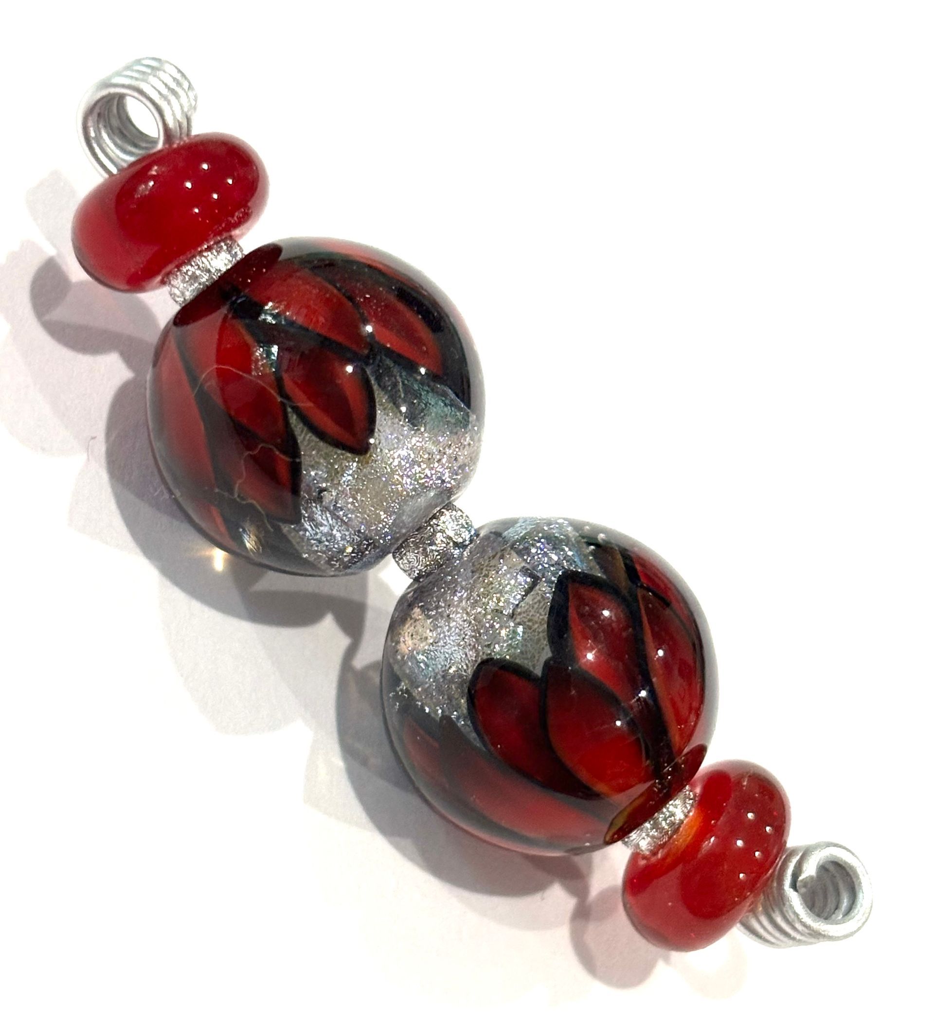 Silver Alchemy Bead Construction begins with a base of Double Helix Zephyr, wrapped in fine silver leaf, covered 104 Precision’s Black Jettum shards and cased with Zephyr clear. Murine accents are applied last.