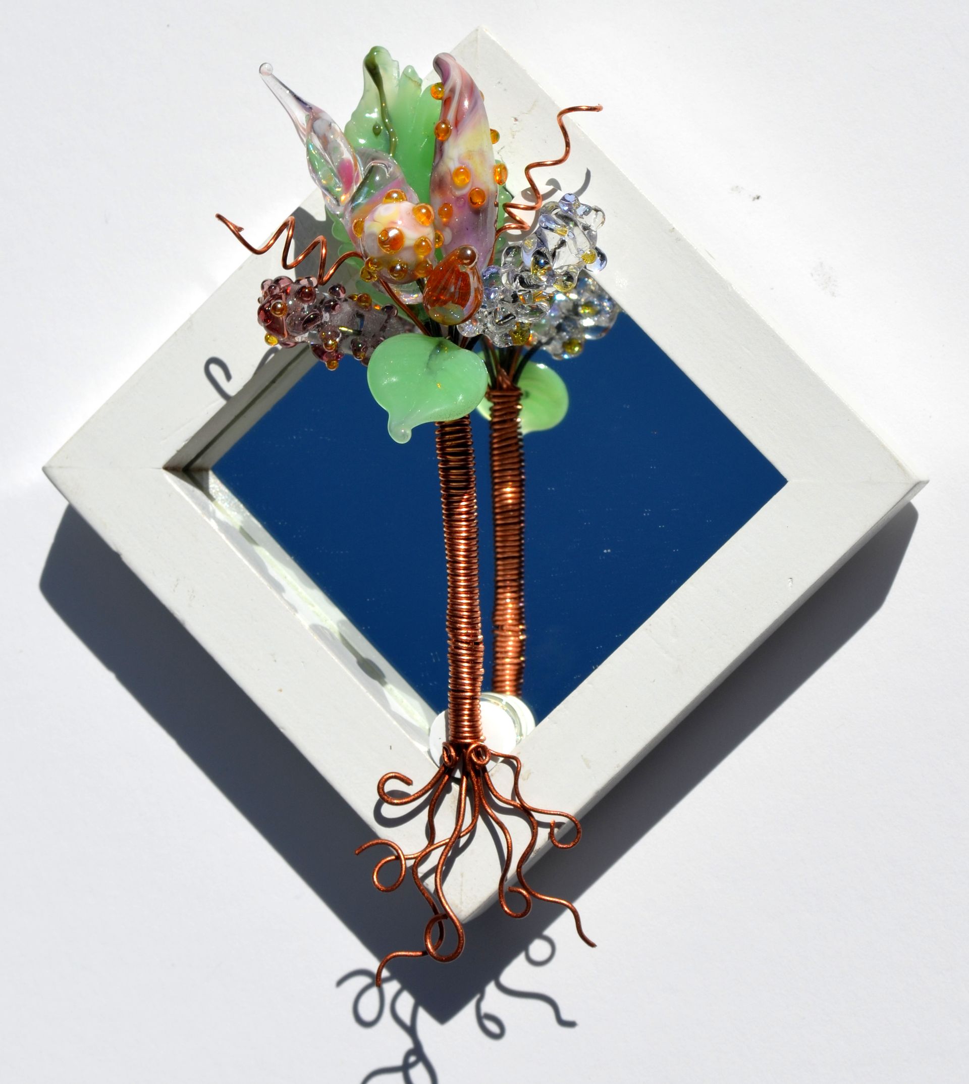 A bouquet of spring flowers on a sparkling bed of leaves and dichroic glass. ~Carol Savage~