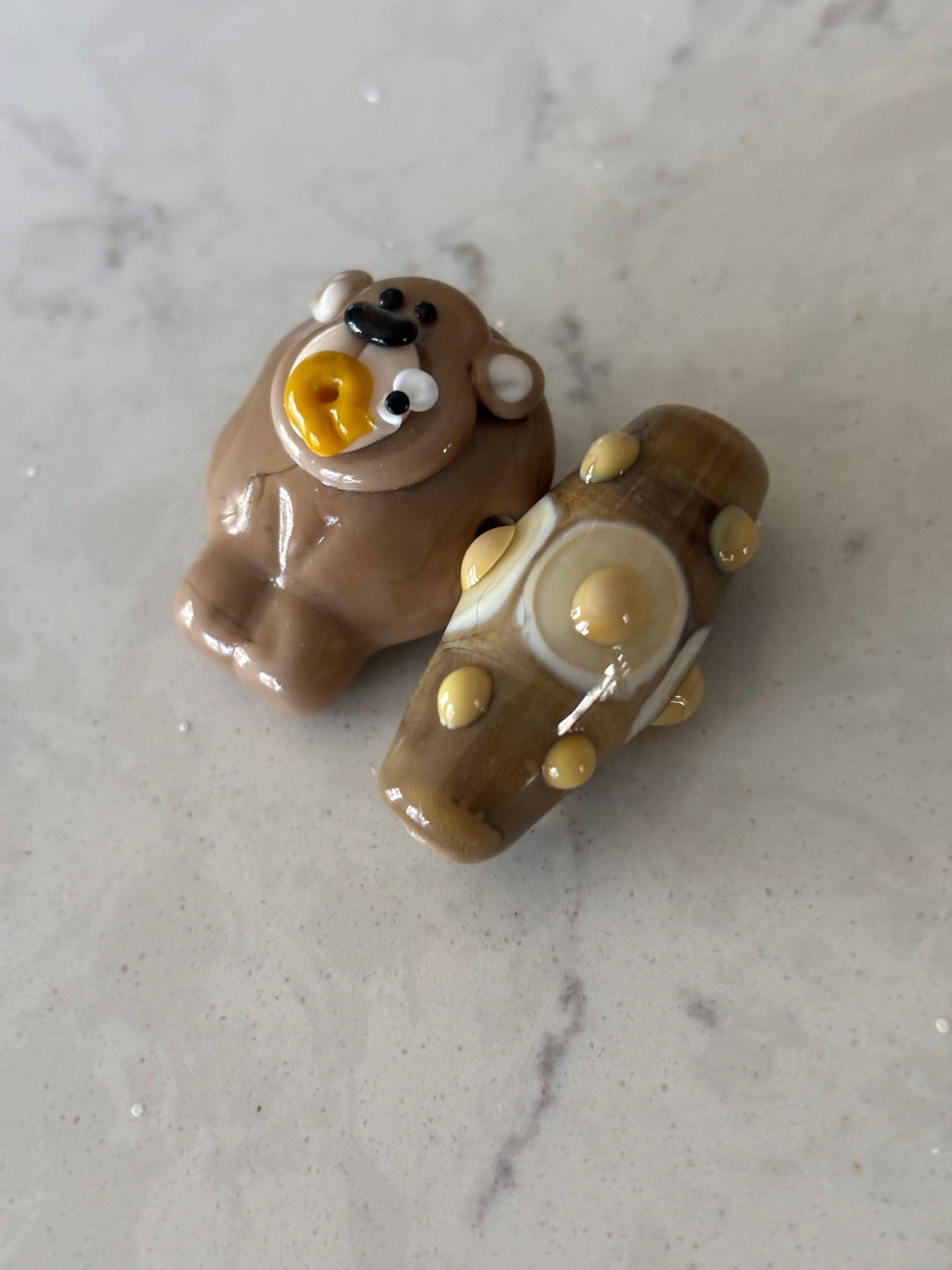 A little coffee-house menagerie: mocha, latte, caramel, and cream! Colors include CIM Canyon de Chelly, Canoe, and Sarfari, Effetre colors Woodie, Sandstone, and White, and Reichenbach Iris Orange. Photo by E. Erin Morris. ~Erin Morris~