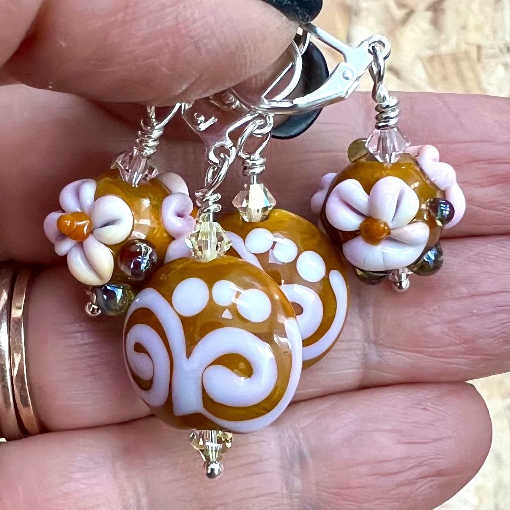 For the Pantone mocha theme's monthly ISGB challenge, I took out a bunch of my glass (all 104 coe) with a coordinating palette and proceeded to make a bunch of beads! They have been strung into a necklace (worn double) with a coordinating bracelet and earrings! These are destined for a fundraiser for a local environmental non profit organization. ~Juliet Page~