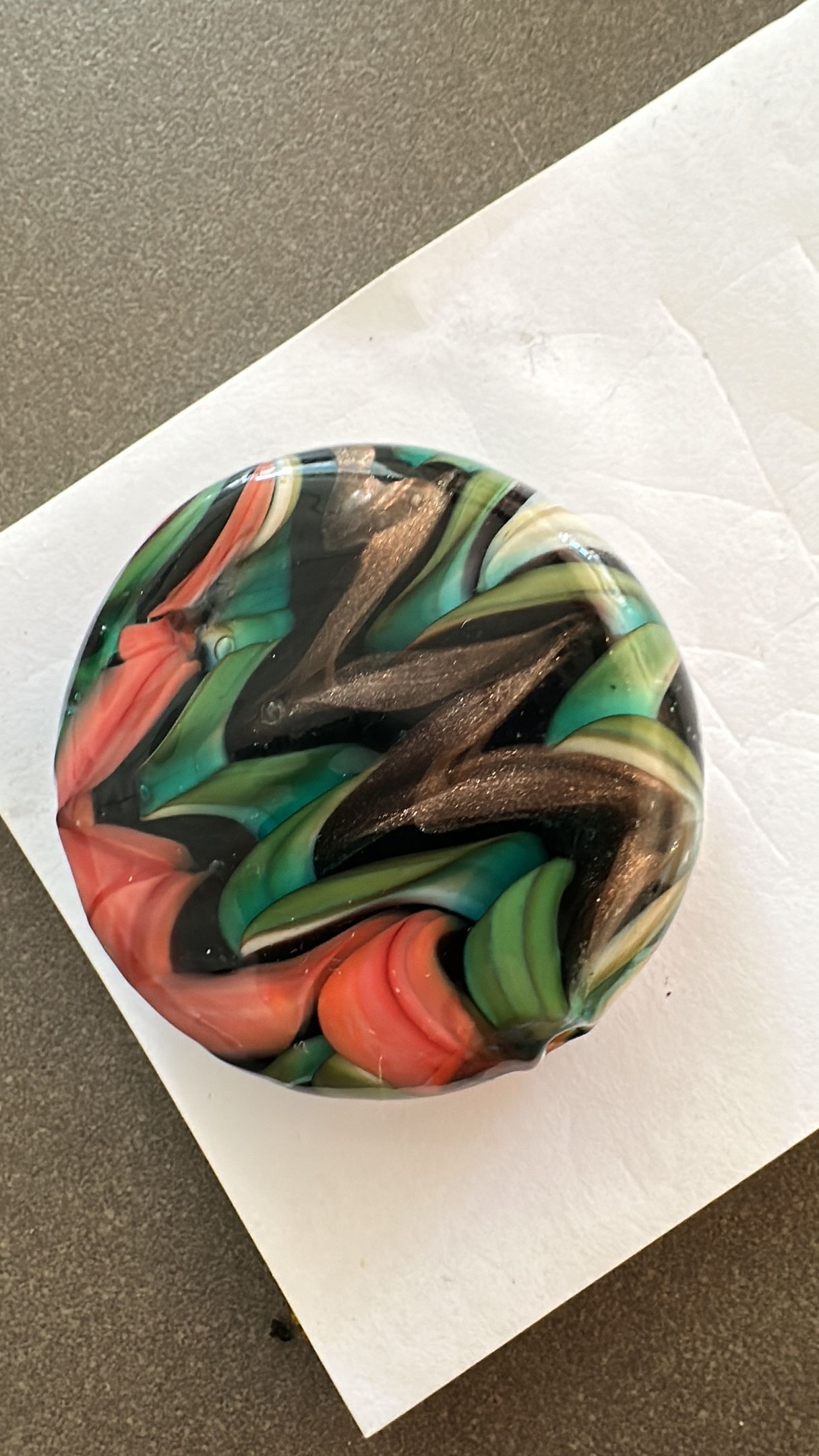 I have to say I had a huge pleasure to work with these colors and it was really a great opportunity to go out of my comfort zone. This bead is a blown bead made with soft glass, mostly Moretti or Vetrofond. It’s about 3 cm diameter. ~Sophie Mottier~