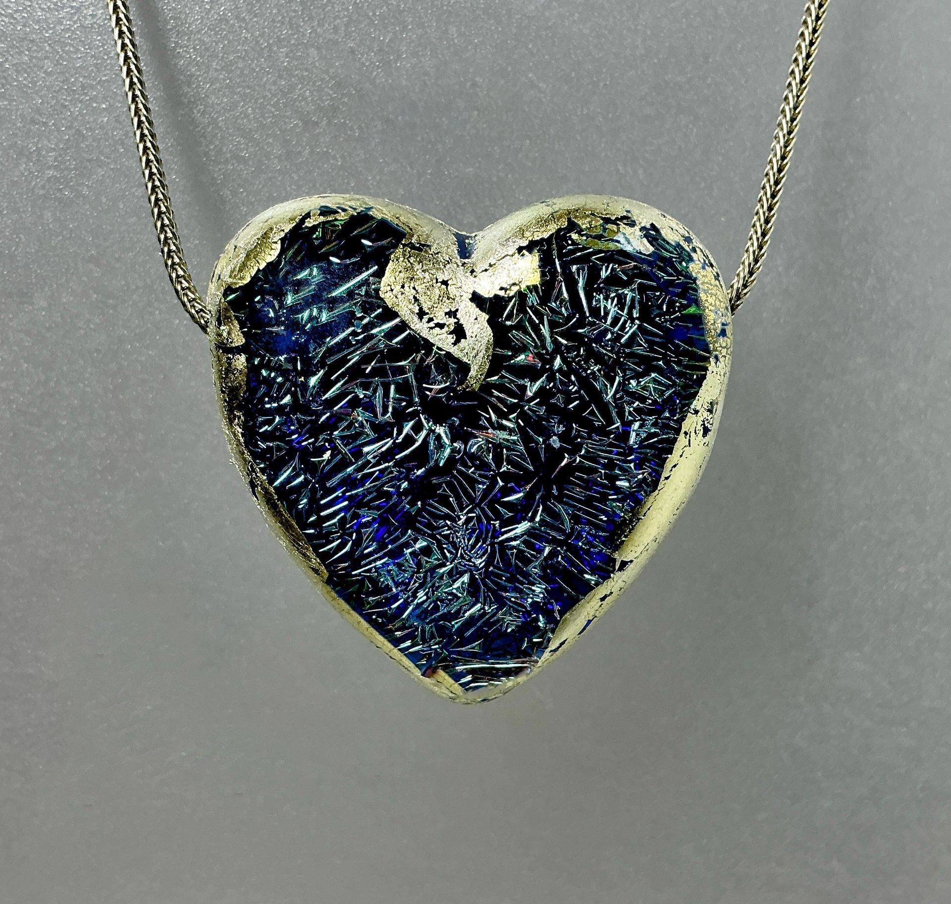 Heart bead - Base of Effetre intense blue, magenta/green Riley Designs crinkle dichroic, edged with white gold leaf. ~Lee Woodburn~