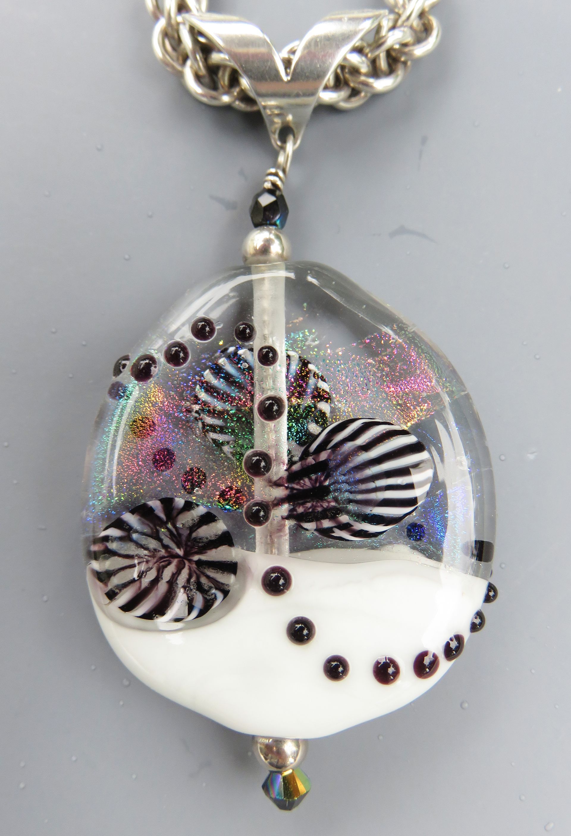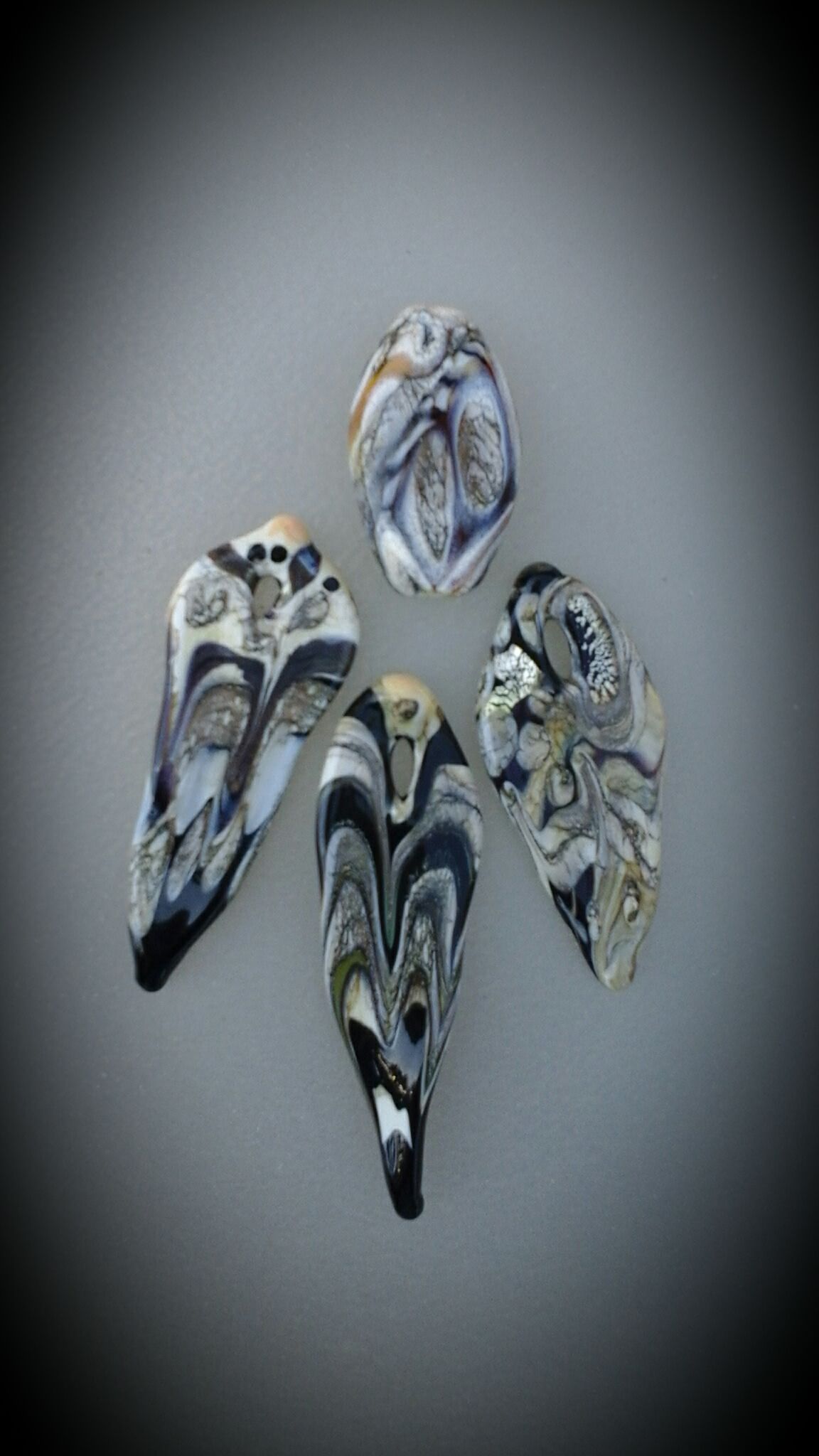 My name is Melanie Rowe and I loved this challenge. I wrapped 2 layers of silver around ivory, then burnished the silver then blew out. I applied the shards randomly to molten glass on bead and off mandrel glass to create the pendants. Then I combed through the shard with dark stringer, then I flattened and pulled the pendant into shape.