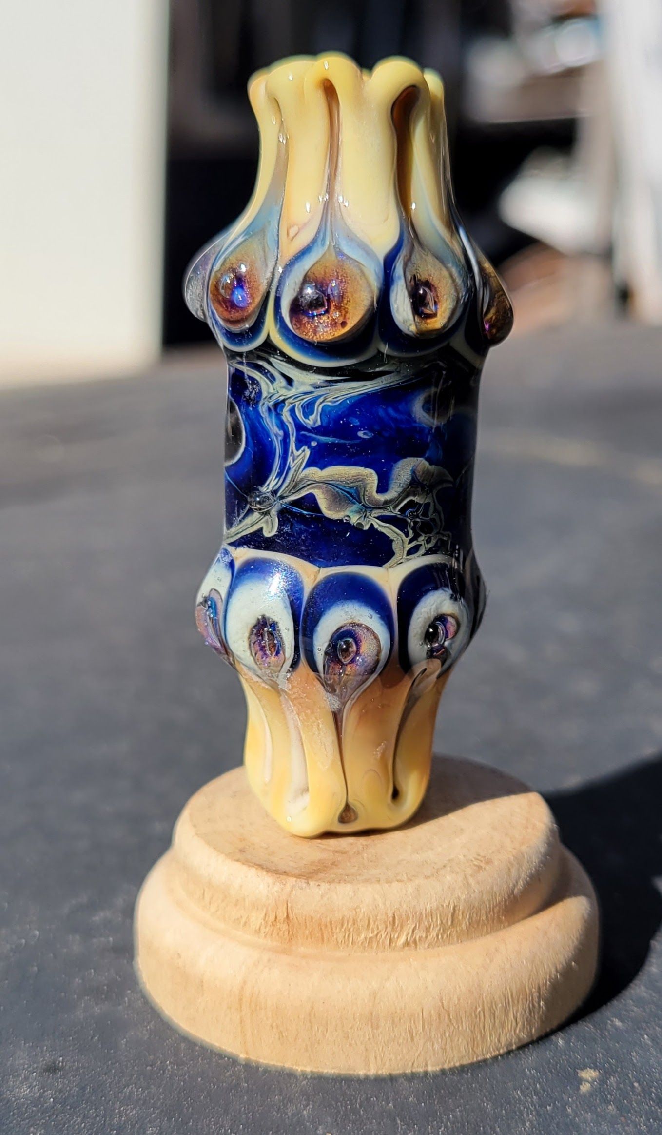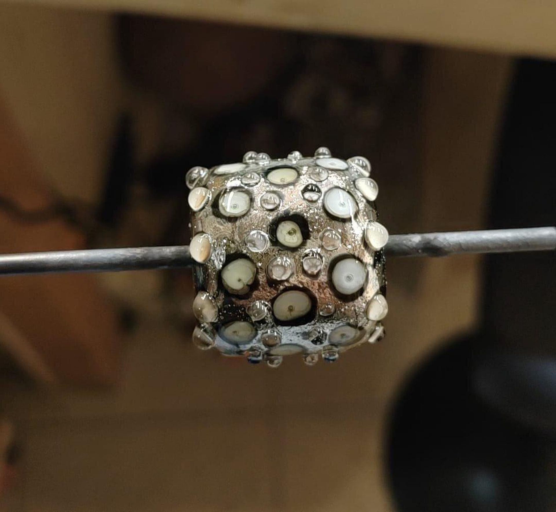 A blown hollow with ivory dots covered in a DH with little silver brown bobbles, reduced